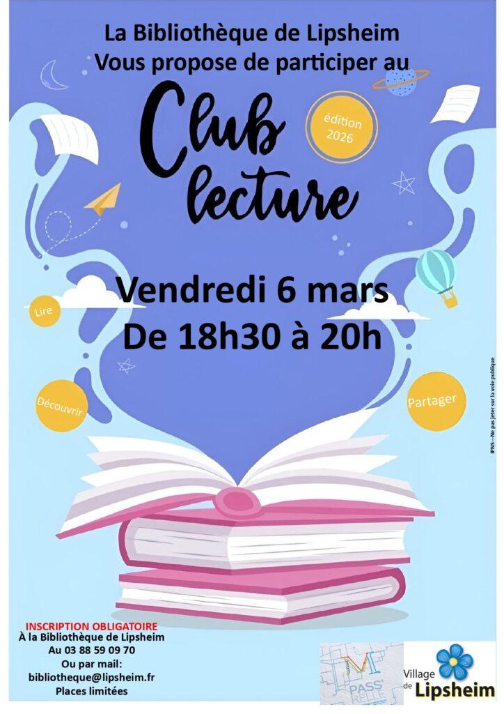 Le Club Lecture du vendredi à commence à 18h30. Inscription à la bibliothèque ou au 03 88 59 09 70 ou par mail : bibliotheque@lipsheim.fr